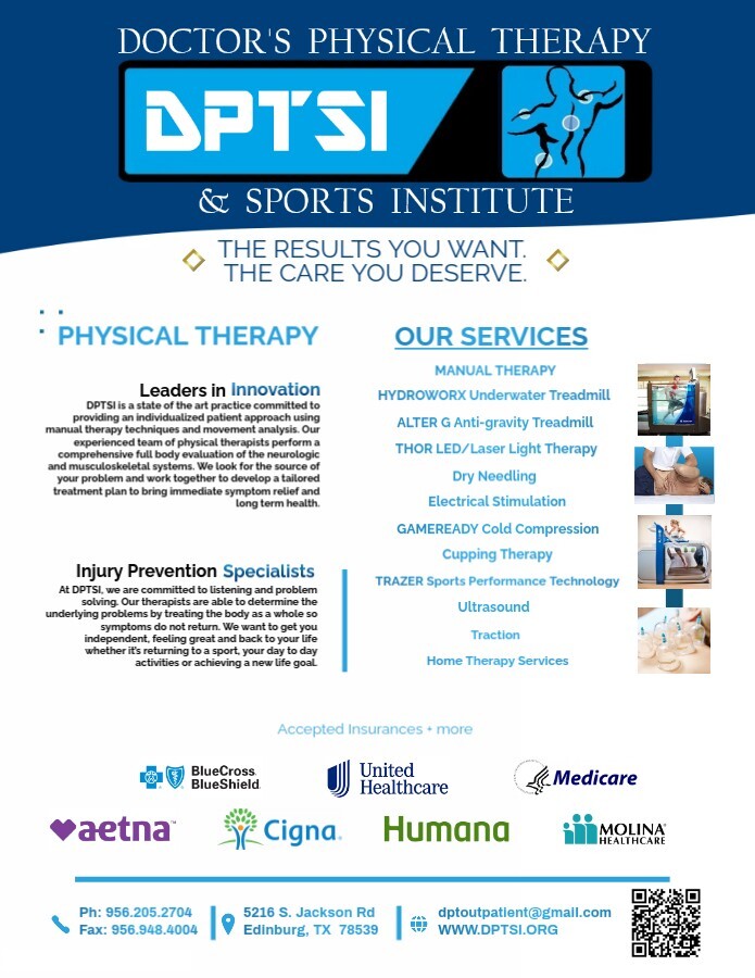 To schedule an appointment with one of the physical therapists at Doctor's Physical Therapy and Sports Institute, please click on the links below or contact DPTSI’s front office at 956-205-2704.